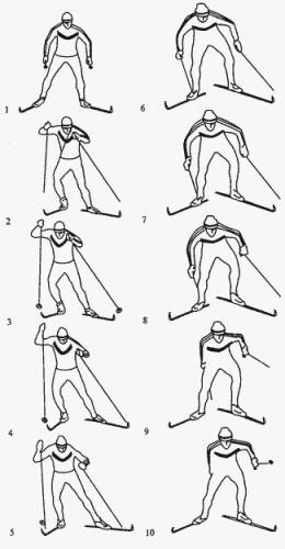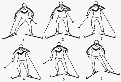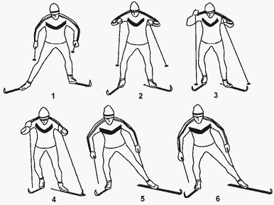 Затем переходят к изучению конькового хода в целом, отталкиваясь поочередно правой и левой ногой. При первых попытках угол отведения носка лыжи не должен быть велик; учащиеся как бы поддерживают скорость, набранную при "разбеге". Главное при этих первых попытках - обратить внимание на координацию движений и отталкивание внутренним ребром лыжи.