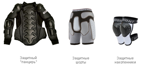 Защитные шорты – защищают бедра, ягодицы и копчик при боковых падениях, а также предотвращают переохлаждение. Изготавливаются из эластичного сетчатого «дышащего» материала, на который крепятся мягкие или жесткие накладки.